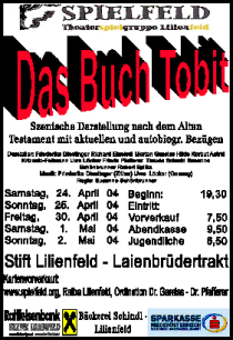 Das Buch Tobit Es traten auf:Friederika DiestingerRichard EinsiedlMerten GareissHilde KorbutAstrid Krizanic-FallmannUwe LöckerFrieda PfeffererTraude SchmidSusanne SchönbrunnerRobert SpilkaRegie: Susanne Schönbrunner